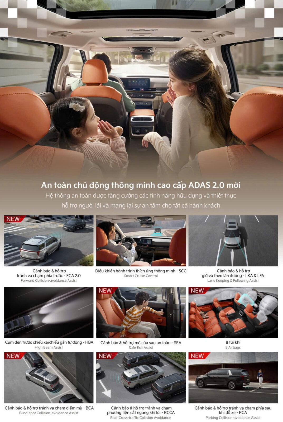 Khác với hệ thống hỗ trợ an toàn trước đó (ADAS 1.5), hệ thống hỗ trợ lái xe an toàn mới – ADAS 2.0 trên Kia New Carnival sẽ được nâng cấp thêm nhiều tính năng cảnh báo và hỗ trợ thông minh hơn để đáp ứng nhu cầu di chuyển hàng ngày của khách hàng và thuận tiện, an toàn hơn khi lái xe đường dài, đặc biệt là trên các tuyến cao tốc. Cụ thể: