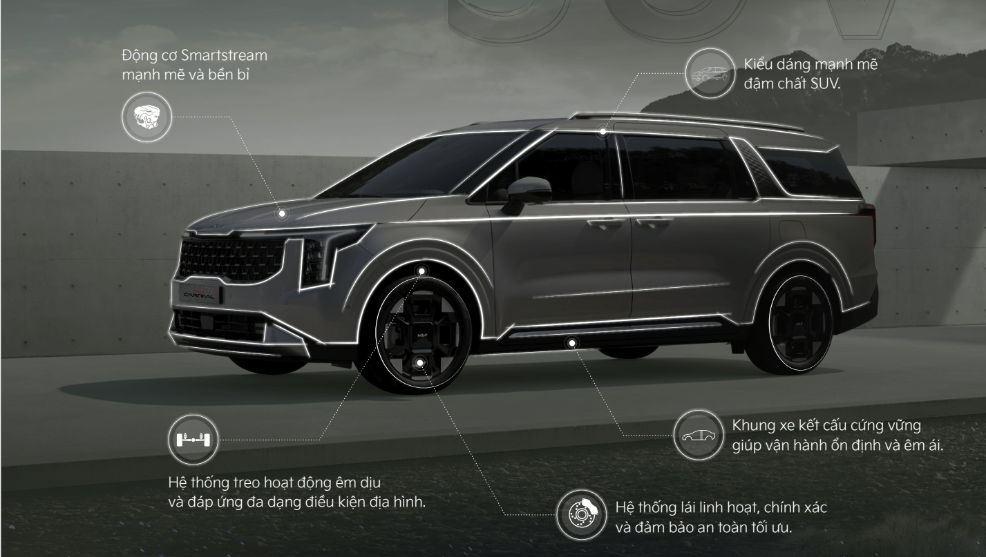 Với hệ thống khung gầm SUV cứng vững, kết hợp hệ thống treo tinh chỉnh phù hợp giúp Kia New Carnival di chuyển linh hoạt, ổn định, khả năng xử lý tốc độ cao tốt, tăng tính khí động học, giảm mức tiêu hao nhiên liệu, đồng thời mang lại sự thoải mái cho khách hàng khi di chuyển trên đa dạng địa hình.
