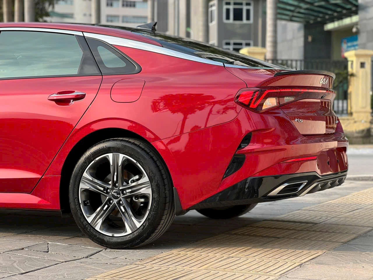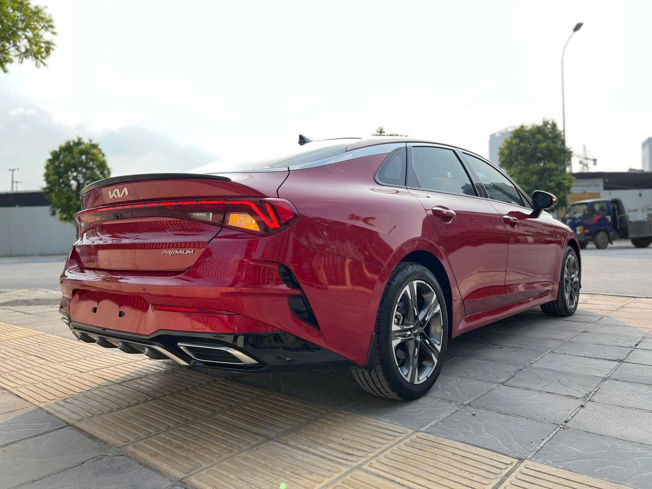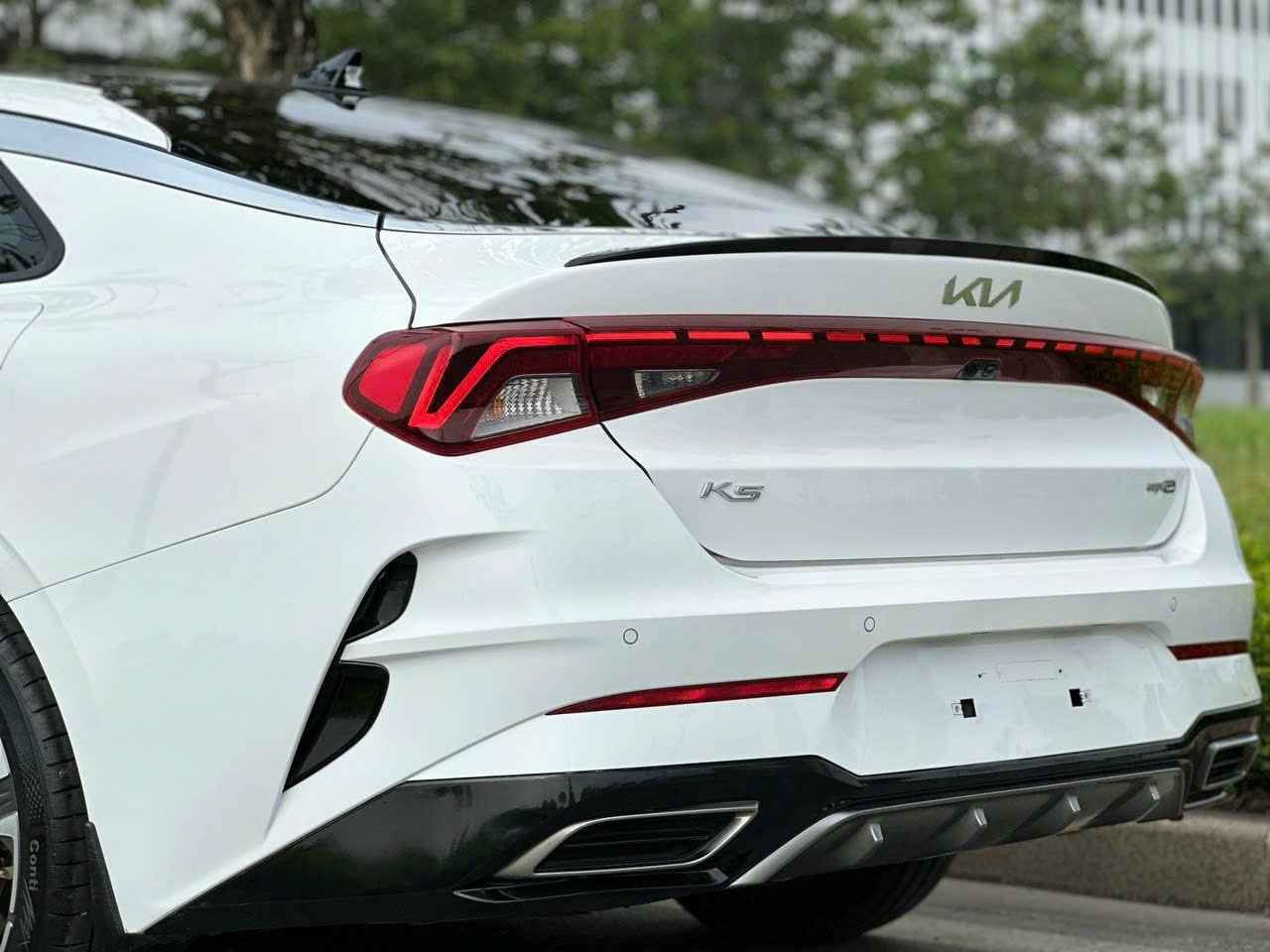 Sự hiện diện của ống xả trên cản trước làm tăng thêm vẻ thể thao cho đuôi xe K5 mới. Tuy nhiên, đừng nhìn quá kỹ vào chúng, bởi vì chúng chỉ có thật trên phiên bản GT-Line. Hãng xe của Hàn Quốc cho biết, cảm biến hỗ trợ đỗ xe phía sau và camera quan sát là tiêu chuẩn trên mọi phiên bản K5.