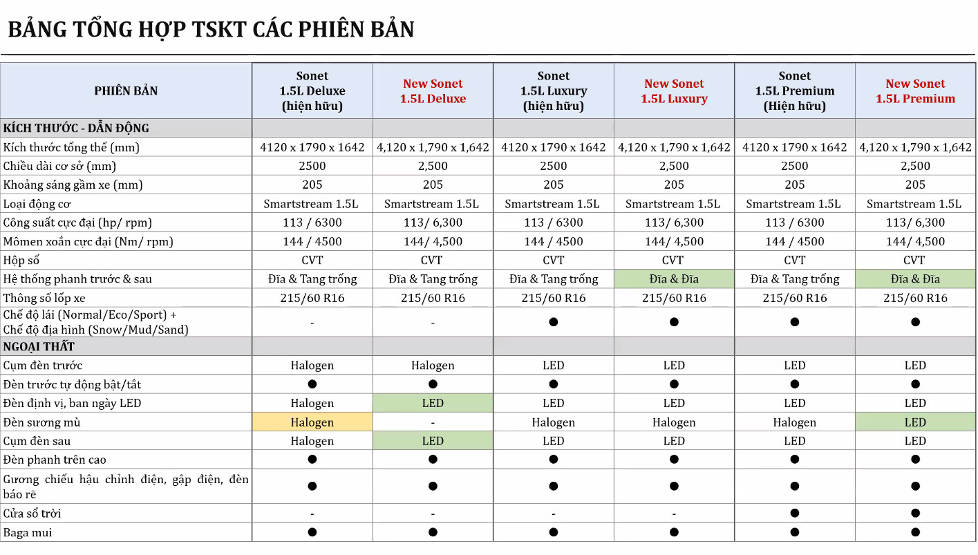 THÔNG SỐ KĨ THUẬT KIA SONET ( Bảng so sánh TSKT giữa KIA Sonet hiện hữu và KIA New Sonet 2024)